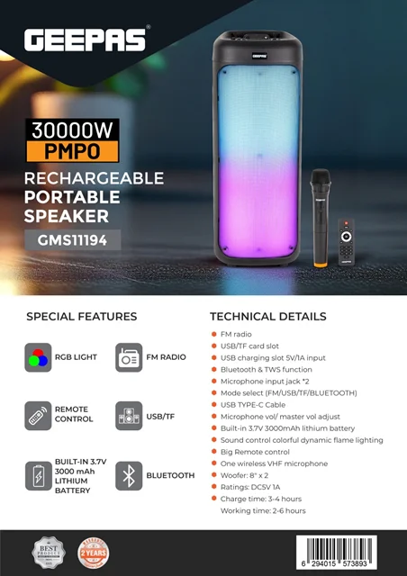 نور RGB، ورودی USB، TF، TWS، رادیو FM، میکروفون VHF