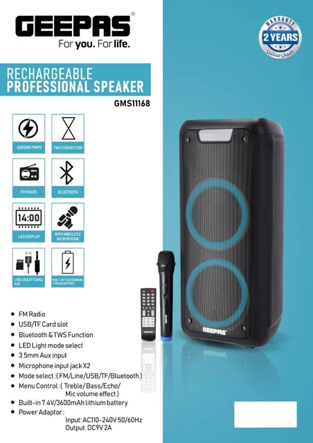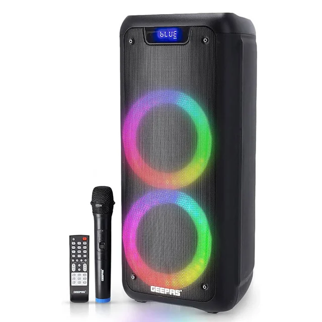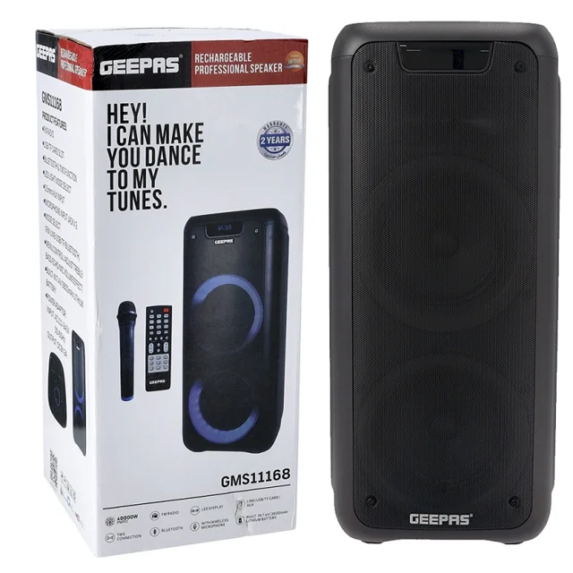 اسپیکر جیپاس امارات دارای ۵ سال گارانتی تعویض اسپیکر بلوتوثی جی پاس مدل GMS11168 یکی از اسپیکرهای پرطرفدار با توجه به قیمت و کیفیت بالای سخت محسوب میشه این اسپیکر با توجه به قابلیت های زیادی که داره شما رو به هرپخش کننده سیستمی بی نیاز میکنه از ویژگی های خوب اسپیکر جی پاس قابلیت TWSبرای اتصال همزمان دو اسپیکر به همدیگه ، دارای رادیو با کیفیت بالا بدون قطعی و اتصالی ،کنترل از راه دور برای پخش و تنظیمات اسپیکر ، میکروفون وایرلس و قابلیت کارائوکه ، منوی تنظیمات Treble/Bass/Echo/ Mic ، دارای رقص نورهای متنوع و 7 رنگ جذاب ، اتصال دو میکروفون به اسپیکر ، برنامه اختصاصی قابل دانلود بر روی اندروید و ios ، اتصال AUX ، ورودی های رم و فلش و... تنها بخشی از قابلیت های این اسپیکر از برند محبوب جی پاس رو شامل میشه